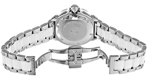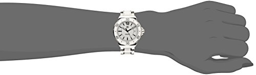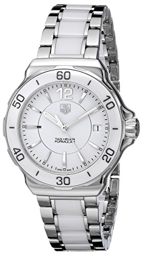 Steel case with a steel bracelet with white ceramic center links. stationary rotating white ceramic bezel. White dial with silver-tone hands and index hour markers. Arabic numeral marks the 12 o'clock position. markers around the outer rim. Luminescent hands and markers. Date display at the 3 o'clock position. Battery operated quartz movement. Scratch resistant sapphire crystal. Screw down crown. Screw down case back. Case diameter: 34.5 mm. Fold over with push button release clasp. Water resistant at 200 meters / 660 feet. Functions: hours, minutes, seconds, calendar. Tag Heuer Formula 1 Ladies Watch WAH1211.BA0861.Feature