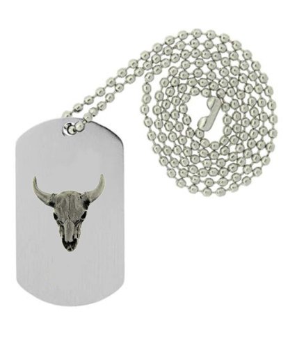 -. Binding : Jewelry -. Department : womens -. Feature : Stainless steel dog tag with design as shown / Includes 36" Metal Chain with clasp / DOG TAG COLOR - High Polish Silver Chrome -. Label : DOG TAGS -. Manufacturer : DOG TAGS -. Model : EE P00731 DT -. MPN : EE P00731 DT -. PackageQuantity : 1 -. PartNumber : EE P00731 DT -. ProductGroup : Pet Products -. ProductTypeName : FASHIONNECKLACEBRACELETANKLET -. Publisher : DOG TAGS -. Studio : DOG TAGS -. Title : Military Emblem Dog Tag w/ Metal Chain Necklace - Animal - Cattle, Bulls and Buffalo - Steer Skull