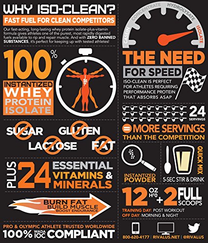 ReleaseDate : 2016-09-22 Studio : Rivalus Publisher : Rivalus Binding : Health and Beauty Product Description Saying “whey protein” is like saying “chair.” Just as there are lots of different types of chairs, whey proteins are available in a variety of different forms. Two of the most common varieties are whey concentrates and whey isolates. From a protein quality standpoint, both are excellent. The key difference is the quantity of protein found in each. Whey protein isolates undergo additional purification steps to remove virtually all of the fat, lactose, and cholesterol, thereby isolating the protein, hence the name. ISO-CLEAN is made with 100% whey isolates (ISO-), which yield a ton of protein, but little else (CLEAN). This fast-acting formula supplies 50 grams of super-pure, super-effective protein plus a host of essential micronutrients to help you max-out every serving. If you’re the “go big, or go home” type, ISO-CLEAN is your protein. 0