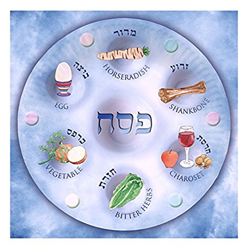 - 12 disposable Passover paper plates, decorated with colourful images of the Seder plate and its symbolic foods - for hot and cold food. Leak proof, grease proof and cut proof. Diameter: 9 inch, 22.5cm, 12 plates in a pack, sealed shrink wrapped, waterproof paper