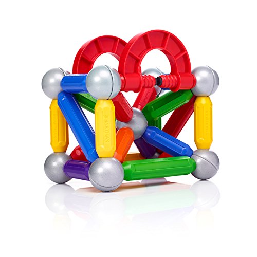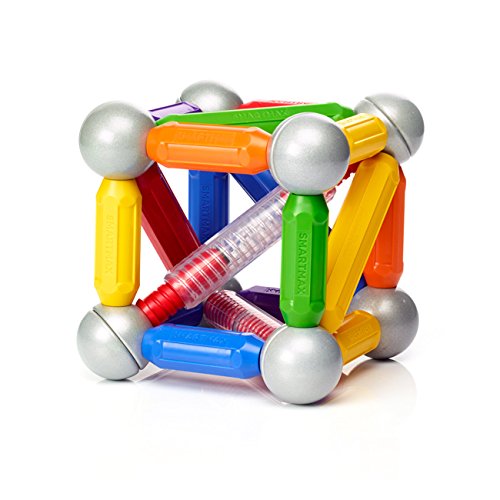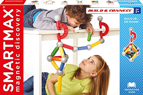 SmartMax Build & Connect offers new features that increase your building options! Connectors can be attached to any structure with a thickness of up to 2 inches, allowing both "up" and "down" building. In addition, included with each connector is an expandable long bar/ball combo. Expandable bars are perfect for when SmartMax creations need a little more length. The Build & connect Set includes 16 medium bars, 4 long bars, 2 red clamps, 2 extendable bars, 4 metal balls with screws and 6 metal balls. SmartMax enables young children to explore magnetism safely, with strong, oversized pieces that are specifically designed for handling by young kids. SmartMax products are safe and durable, made from the highest quality materials. Our magnets are incredibly strong, able to carry up to 60 times their own weight! SmartMax magnetic bars feature unique color codes: "Cold"-colored bars (blue, green, purple) attract "warm" colored bars (red, orange, yellow). Warm-colored bars repel other warm-colored bars, cold-colored bars repel other cold-colored bars. SmartMax products include complete, colorful guides with both product information and sample designs. All parts can be combined with all existing SMARTMAX® sets, creating an endless range of possibilities!
