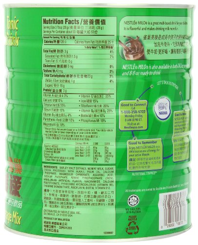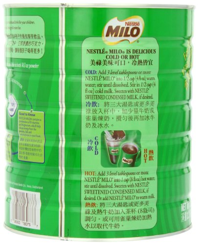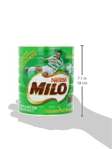 Nestle Milo chocolate beverage mix jumbo tin contains 3.3 pounds of Milo. Milo is nutritious energy drink kids love. Just one glass of Milo with milk provides children with 50% of their daily iron, calcium, Vitamin B1 and Vitamin C needs. Drinking milo gives kids calcium for strong bones and teeth, iron to carry oxygen around the body, b vitamins (B1 and B2) to release energy, vitamin C for iron absorption, vitamin A, which is essential for healthy eyesight, plus, each glass of milo is low GI.