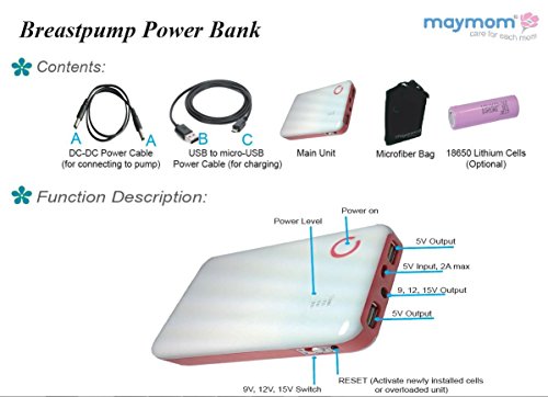 Your power bank for breastpumps. Suitable for Medela pump in style both 9V and 12V models, Freestyle (12V) and spectra S1, S2 pumps.