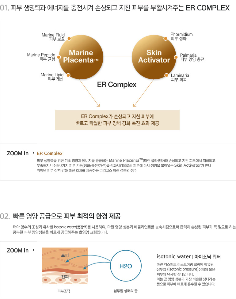 | 손상되고 지친 피부를 빠르게 되살려주는 프리미엄 피부 자생 크림 ① 강력한 마린 자생 성분인 ER Complex (Expert Restoring Complex. 엑스퍼트 리스토어링 컴플렉스)를 고농축 함유하여, 손상되고 지친 피부에 빠르고 탁월한 피부 자생 촉진 효과를 제공합니다. *ER Complex (Expert Restoring Complex 엑스퍼트 리스토어링 콤플렉스) 피부 생명력을 위한 기초 영양과 에너지를 공급하는 marine placenta™ (마린 플라센타)와 손상되고 지친 피부에서 저하되고 부족해지기 쉬운 3가지 피부 기능(방어/재충전)을 강화시킴으로써 피부에 다시 생명을 불어넣는 Skin Rejuvenator(스킨 리쥬버네이터)가 만나 뛰어난 피부 자생 촉진 효과를 제공하는 리리코스 마린 성분의 정수 ② 태아 양수의 조성과 같은 isotonic water (등장액)를 사용하여, 마린 영양 성분과 에몰리언트를 농축시킴으로써 급격히 손상된 피부가 꼭 필요로 하는 풍부한 피부 영양 성분을 빠르게 공급해주는 초영양 크림입니다. ③ 풍성하고 리치한 고급스러운 텍스처 및 사용감으로 바르는 즉시, 매끄럽고 유연한 피부결로 마무리해줍니다. |