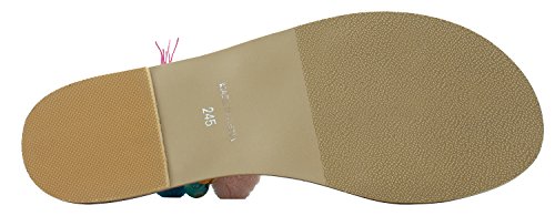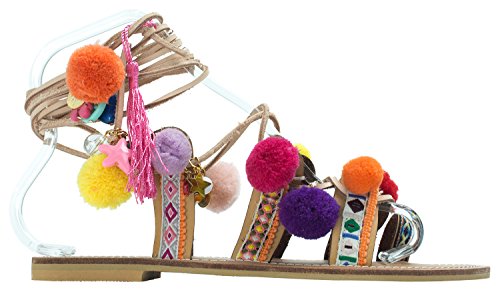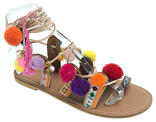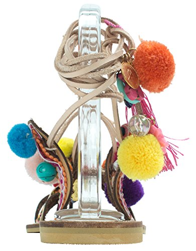 Binding : Apparel Product Description Multicoloured Ball Pom Poms Flat Sandals by AnnaKastle. This gladiator sandal features leather straps upper, and multicoloured pompoms, stones, beads, metal charms and tassel details Pair it with your favorite shorts or skirts for trendy and bohemian look. 0