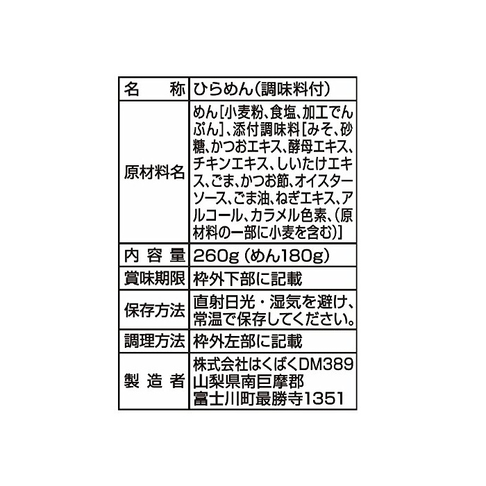 원재료:면(소맥분,식염,가공 전분) 첨부 조미료(된장,설탕,가다랭이 엑기스,효모 엑기스,치킨 엑기스,표고버섯 엑기스,참깨,가다랭이절,오이스터 소스,참기름,파 엑기스,알코올,카라멜 색소,「원재료의 일부에 밀을 포함한다」