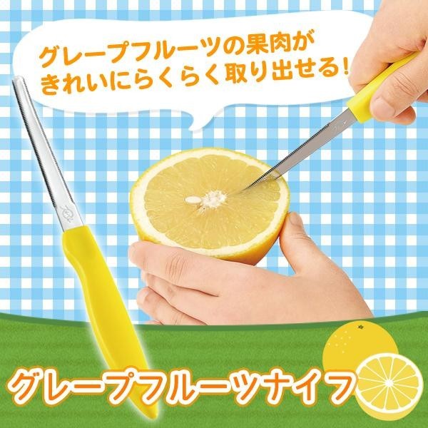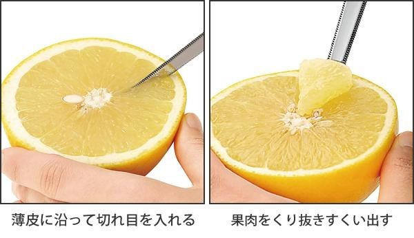 半分にカットしたグレープフルーツの薄皮に沿って切れ目を入れ、果肉をすくい出せるグレープフルーツナイフです。