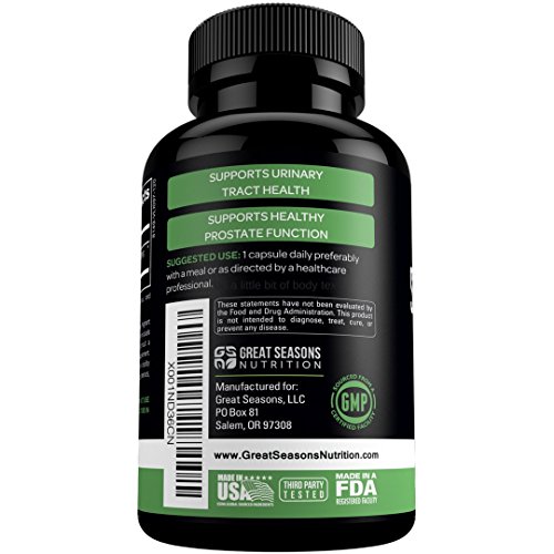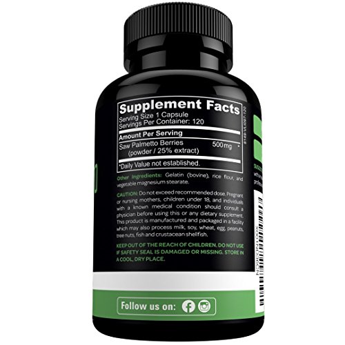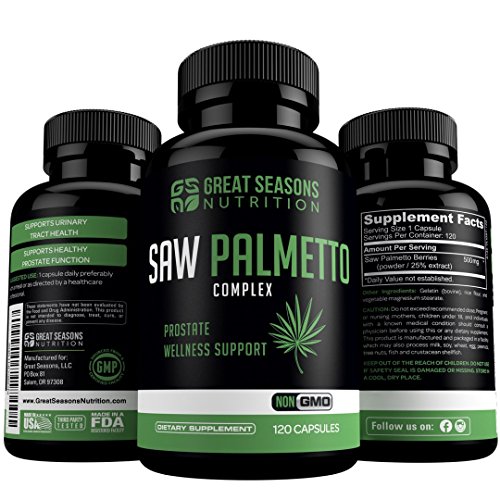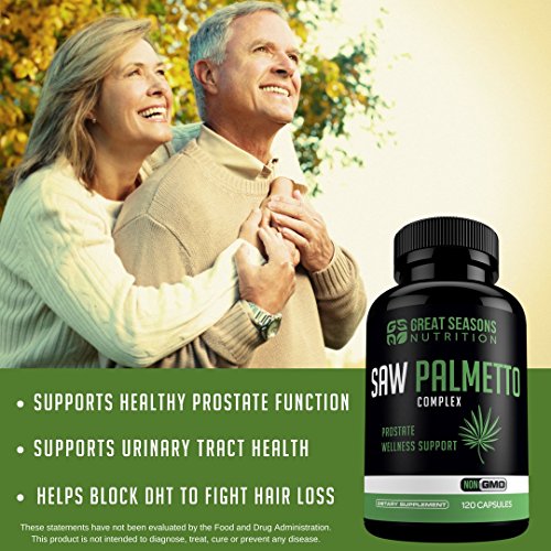 -. Feature : Are you a male over 40? If so, it may be time to start thinking about prostate health! Take control of your prostate health by taking Great Seasons Nutrition's Saw Palmetto Complex! Our Saw Palmetto formula contains a total of 500 mg of both the powder and extract from Saw Palmetto berries for promoting prostate health and fighting hair loss naturally. Just take one capsule a day! / SAW PALMETTO COMPLEX - Great Seasons Nutrition's Saw Palmetto capsules contain both Saw Palmetto powder and extract from Saw Palmetto berries to offer maximum results! / SUPPORTS HEALTHY PROSTATE FUNCTION - The Saw palmetto berry contains fatty acids, plant sterols, and flavonoids that may help improve prostate health and may assist in reducing PSA levels through anti-inflammatory mechanisms. / FIGHT HAIR LOSS NATURALLY - Research sests that Saw Palmetto Complex may be useful in preventing and managing hair loss. Saw palmetto extract may help block 5-alpha-reductase, an enzyme that converts testosterone to DHT leading to reduced hair loss. / QUALITY YOU CAN TRUST - Great Seasons Nutrition's Saw Palmetto supplements are Non-GMO and proudly manufactured in a FDA registered facility which follows strict GMP (Good Manufacturing Practice) guidelines. Our product goes through third party testing which verifies that it is of high quality, consist of the ingredients listed on the label, and does not include any undeclared ingredients.
