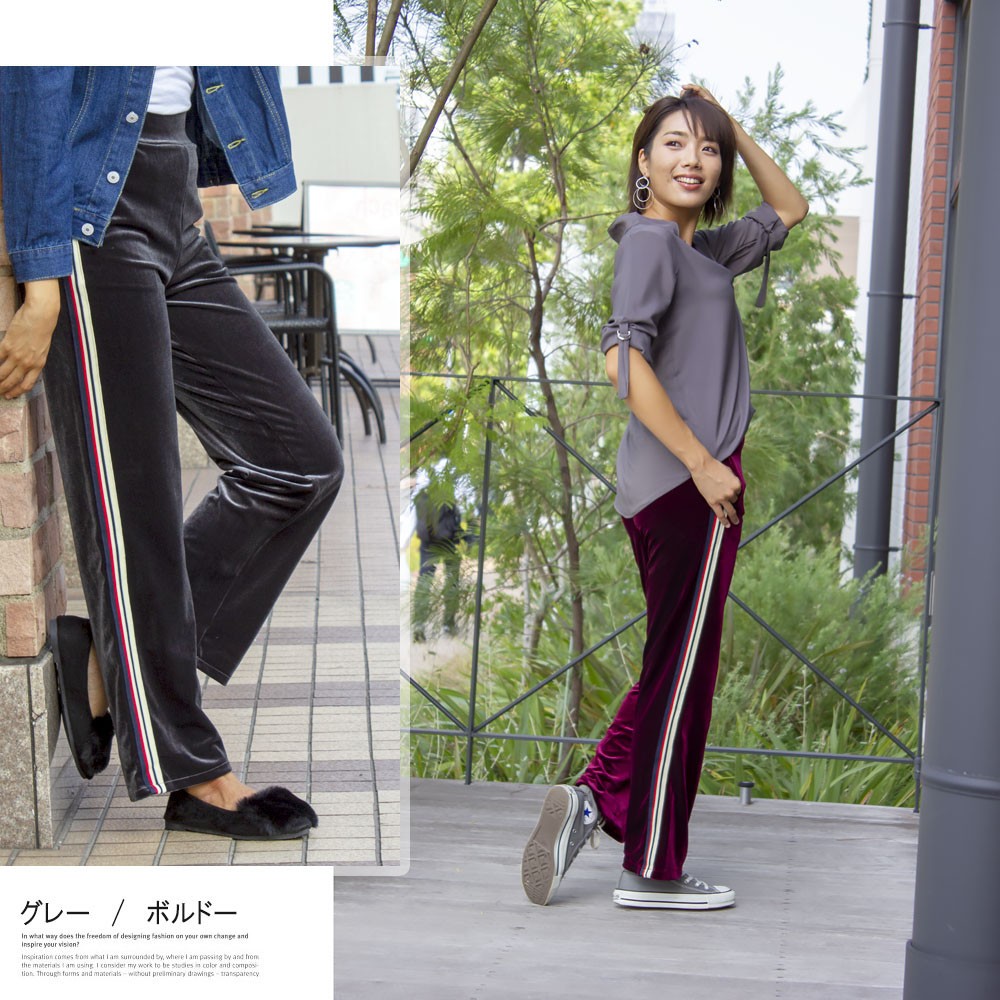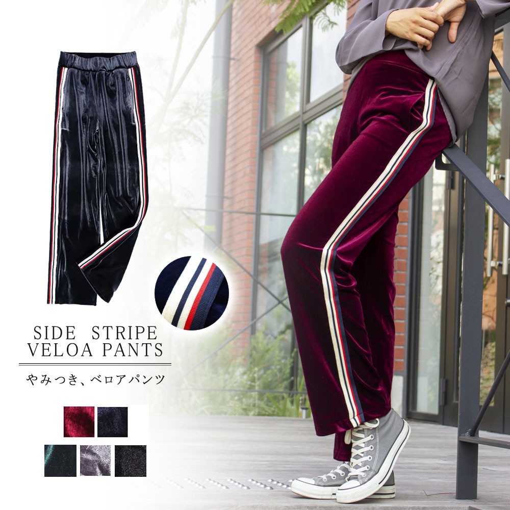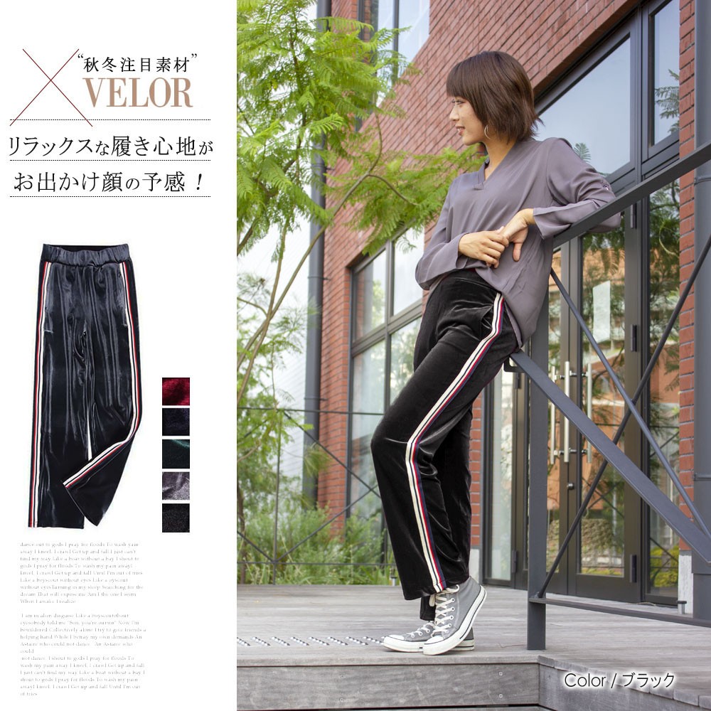 旬のベロア素材をスポーティに着こなすサイドラインジャージパンツ