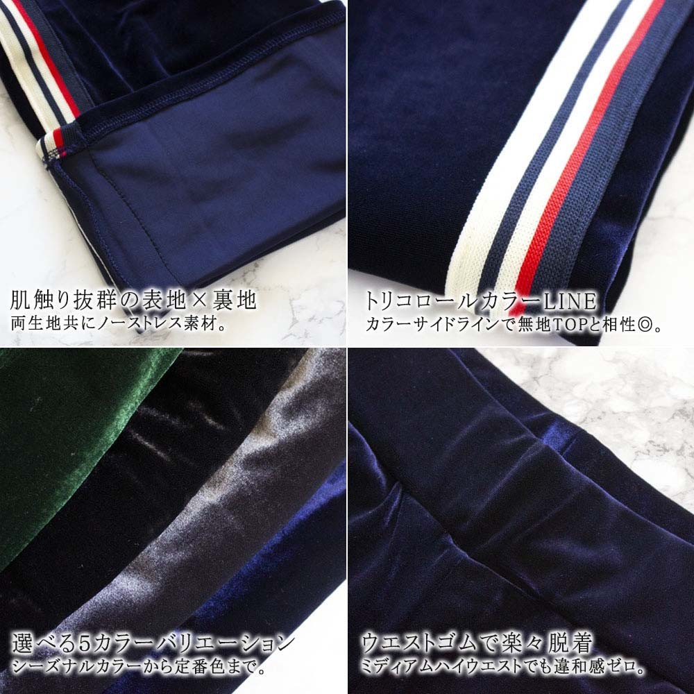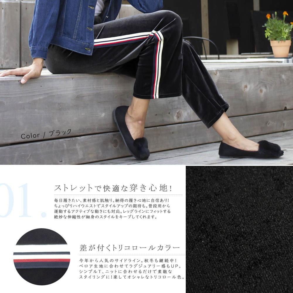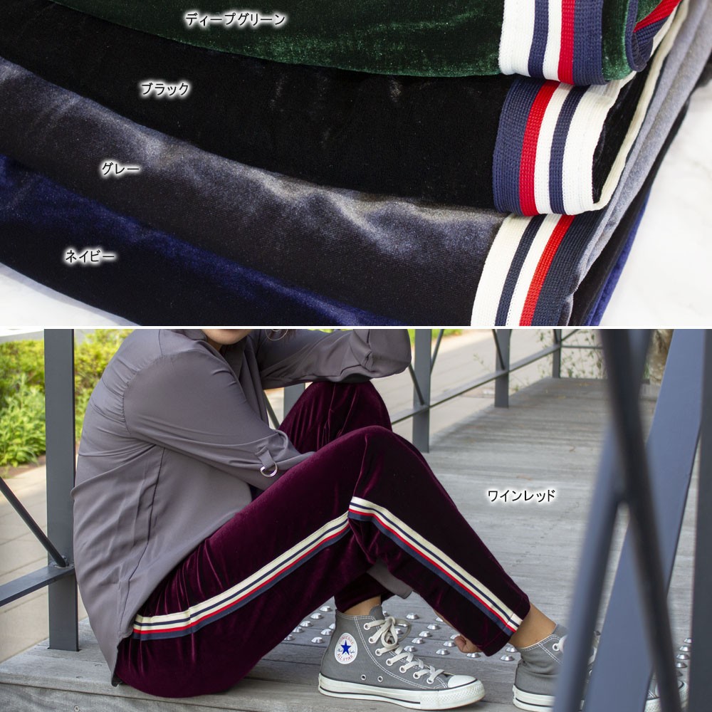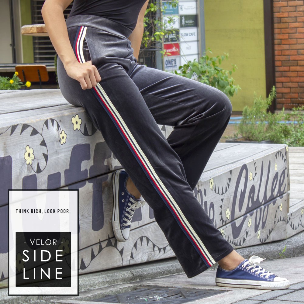 旬のベロア素材をスポーティに着こなすサイドラインジャージパンツ