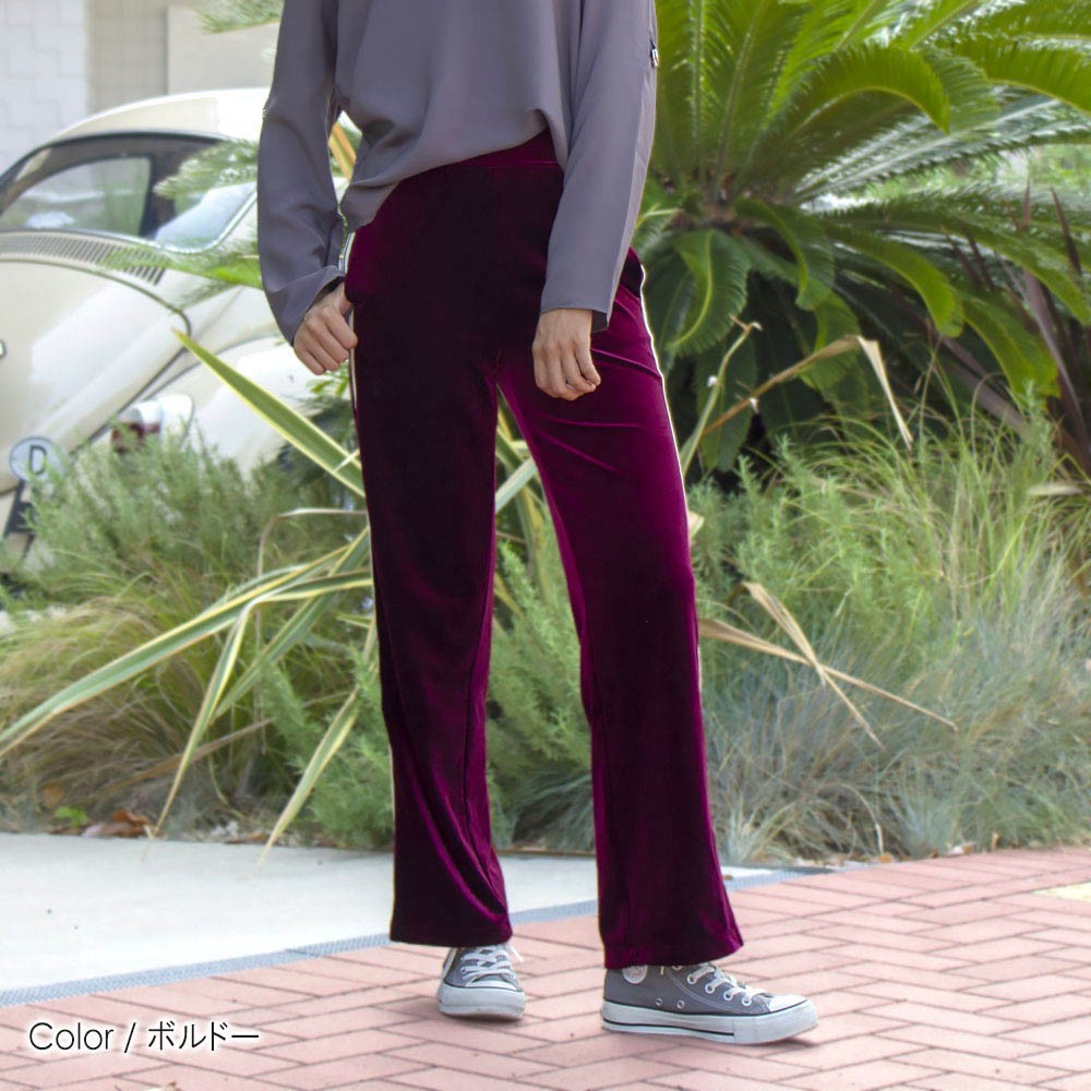 コメント:締め付け感がなく、しっとりとしたベロア生地は肌触りがよく、ウエストゴム仕様のリラックス感もお気に入りのワイドパンツです。股下丈が長く、低身長さんに不向きかもしれないが、ヒールを履くなど工夫すれば足が長く見えてスタイルアップになります。