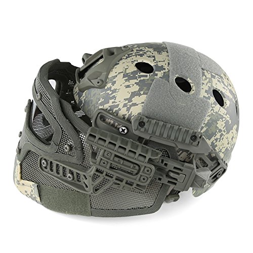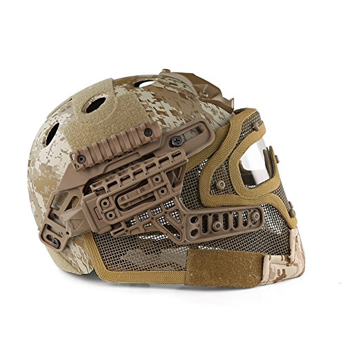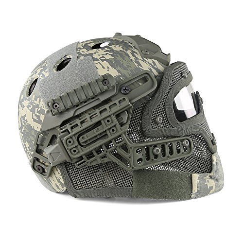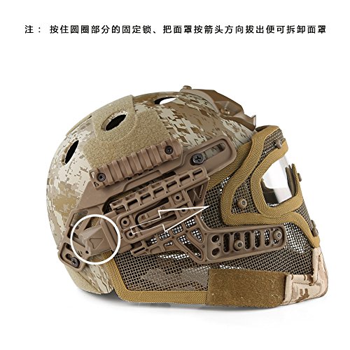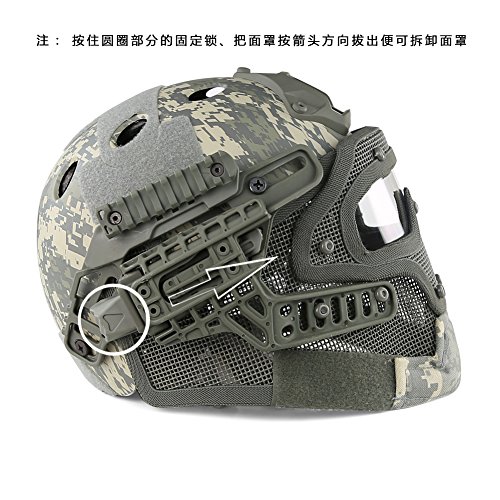 -. Feature : If you are looking for Fast Standard Helmet, then Search our PJ ( ASIN: B011QZ1COK ), MH( B012FNJ9VK ), BJ ( B01G6O2JN4 ) - PJ, BJ and MH Type for Fast Helmet Series. / ABS engineering plastics ( Helmet ) + Low-carbon steel ( Steel netting ) + PC ( Goggles ) -This high version helmet is a perfect combination of head defense and facial defense, save your time to choose mask and goggles, you can also use the helmet separately without the facial system / The guide rail can carry flashlight, battery box, communication tools and other tactical equipment. With advanced locking system, you can twist knob on the back of the helmet to adjust the helmet width, make it comfortable to wear / The transparent PC lens can resist at least 420 FPS, which can meet all requirement of outdoor protective equipment like airsoft, etc / Suitable for head circumference 20.5"-24" and used for all kinds of outdoor activities such as live CS, airsoft, paintball