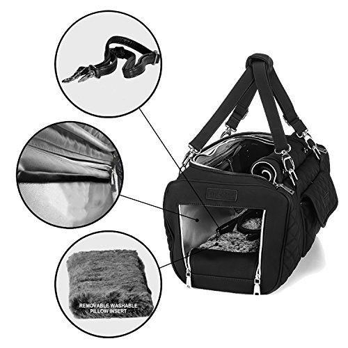 -. Feature : Car Seat / Designer Handbag / Pet Bed / Airline Compliant / Hands-free walking leash & interior safety belt leash attachment.