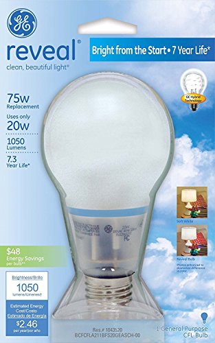 Set of 6 GE Lighting 63511 Reveal Bright from the Start CFL 20-Watt (75-watt replacement) 1050-Lumen A21 Light Bulb with Medium Base
