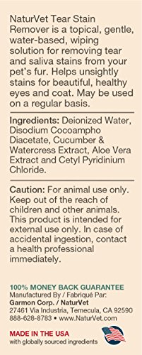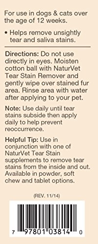 -. Feature : Tylosin free formula is a gentle and effective, topical water-based wiping solution for removing tear and saliva stains from your pet's fur. / Helps unsightly stains for beautiful, healthy eyes and coat. Gentle enough to use on a regular basis to prevent reoccurrence. / Liquid 4oz for external use only on Dog and Cats over the age of 12 weeks. Do not use directly in eyes. Moisten cotton ball with NaturVet Tear Stain Remover and gently wipe over stained fur area. Rinse area with water after applying to your pet. Use daily until tear stains subside and to help prevent reoccurrence. Use in conjunction with one of NaturVet Tear Stain supplements to remove tear stains from the inside and out. / All NaturVet products are veterinarian formulated and manufactured in the USA in an FDA audited, cGMP compliant facility. / 100% Satisfaction Guarantee.