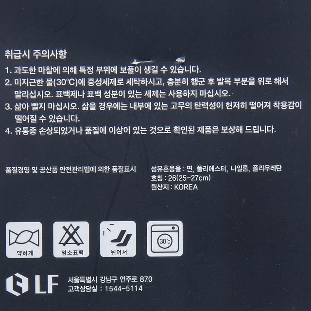1.과도한 마찰에 의해 특정 부위에 보풀이 생길 수 있습니다. 2.미지근한 물(30도)에 중성세제로 세탁하시고 충분히 헹군 후 발목 부분을 위로 해서 말리십시오. 표백제나 표백 성분이 있는 세제는 사용하지 마십시오. 3.삶아 빨지 마십시오. 삶을 경우에는 내부에 있는 고무의 탄력성이 현저히 떨어저 착용감이 떨어질 수 있습니다.