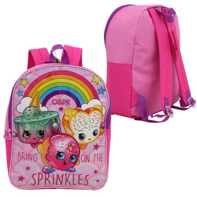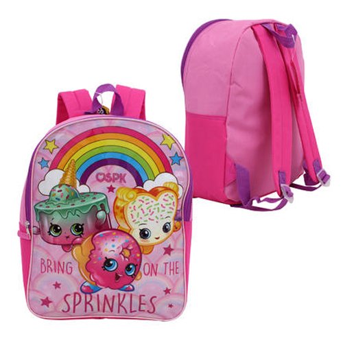 -. Feature : Shopkins SP.R.Inkles Cordura Glossy Backpack features D'lish Donut, Fairy Crumb, and Ice Cream Kate on a pink background / Adjustable padded shoulder straps / Item Size: 15" X 12" X 5"