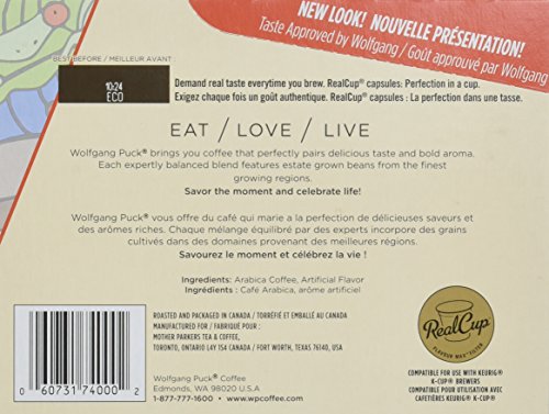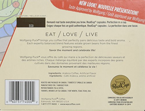 A medium roast infused with rich coconut by Wolfgang Puck; Includes 4 boxes of 24 count.