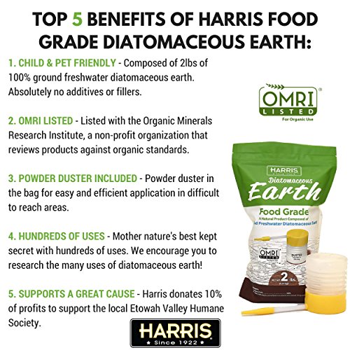 Harris Diatomaceous Earth is listed with the Organic Minerals Research Institute (OMRI) for organic use. It's sealed tight and packaged in a 2lb bag that can be resealed and easily reopened for ongoing usage. Included in the bag is a powder duster, allowing for easy application of a fine dusting of powder.