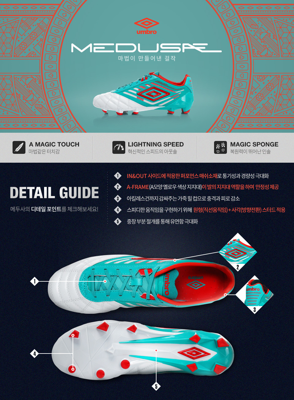 특징 ▶ 전천후 그라운드에서 착화 가능한 메두사 축구화입니다.