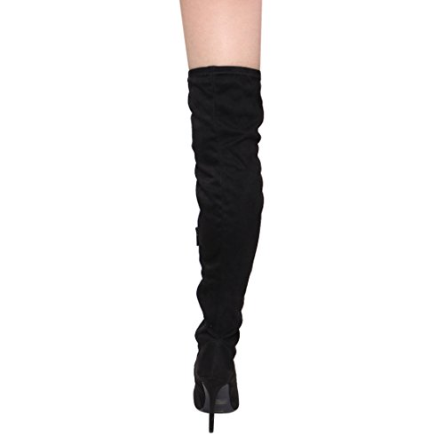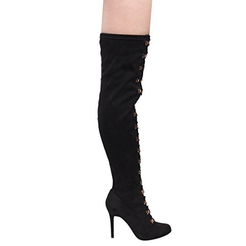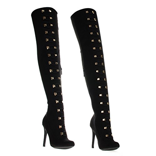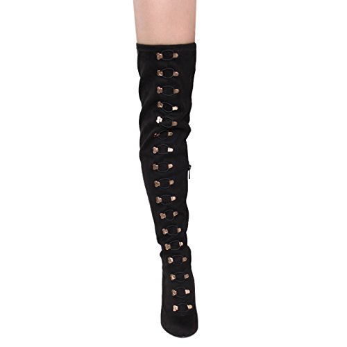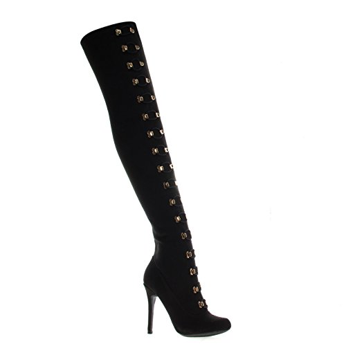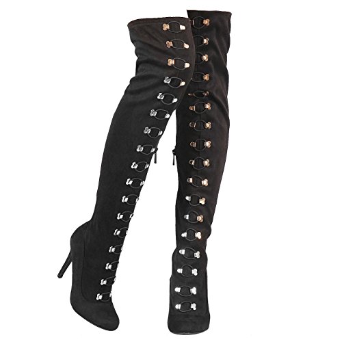 Binding : Apparel Product Description Sexy dominatrix military inspired over the knee boots with corset lace up and lower side zipper closure and metal hardware details. The high heel measures x inches tall, the shaft is x inches and the circumference is x inches wide. The lace is functional so it can be expanded to fix wider thighs. (Please note that these measurements are based on a size 7). Style fits true to size. Available in Black etc. All man made materials. By Anne Michelle 0