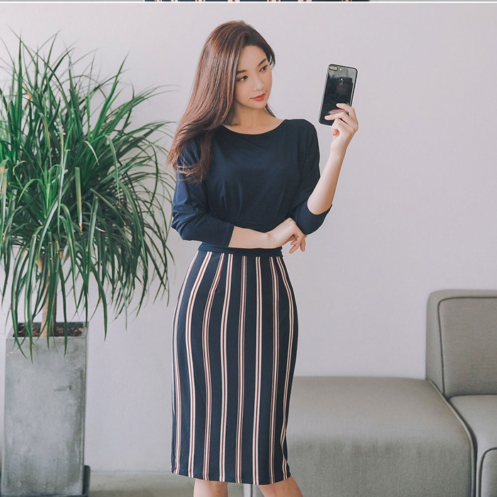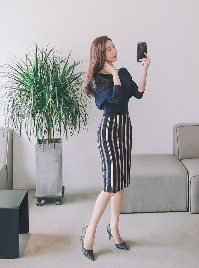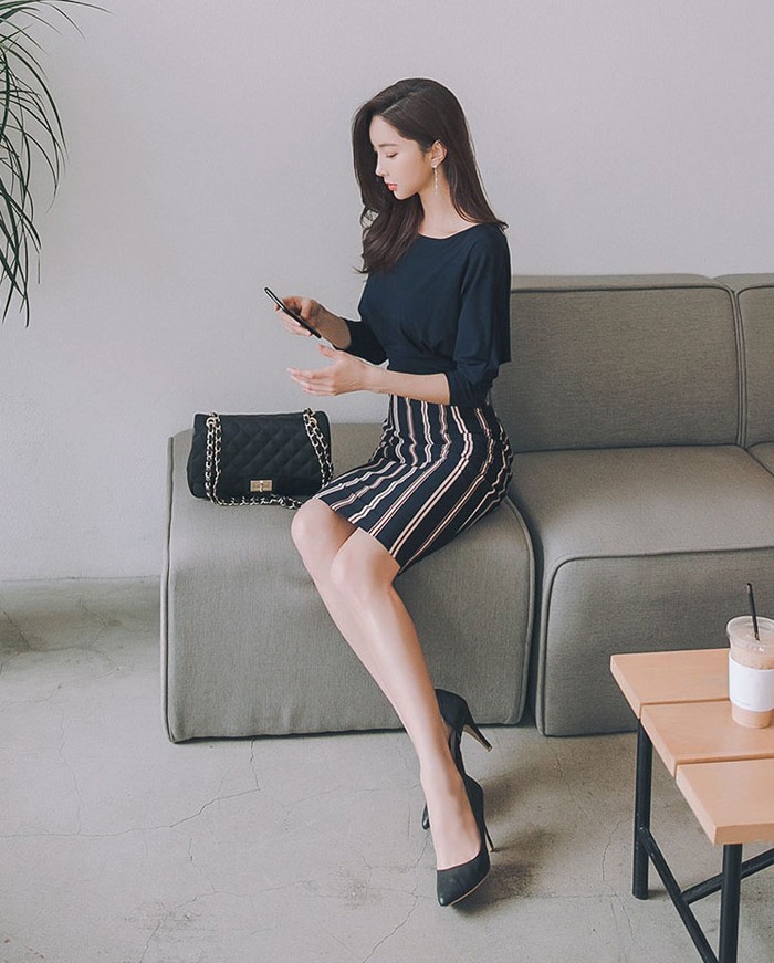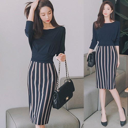 商品名:ワンピース バイカラー ドルマン 膝丈 ストライプ きれいめ 通勤