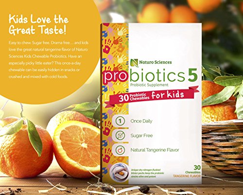 KIDS LOVE THE GREAT TASTE: Easy to chew. Sugar free. Drama free... and kids love the great natural tangerine flavor of Naturo Sciences Kids Chewable Probiotics. Have an especially picky little eater? This once-a-day chewable can be easily hidden in snacks or crushed and mixed with cold foods.