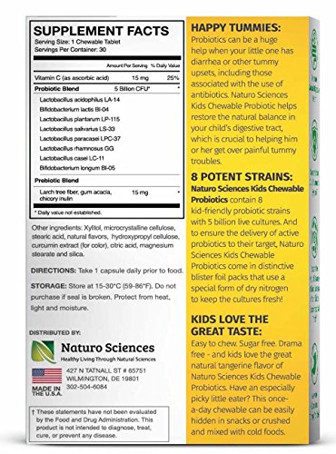 PARENTS LOVE THE EFFECTIVENESS: Naturo Sciences Kids Chewable Probiotics contain 8 kid-friendly probiotic strains with 5 billion live cultures. And to ensure the delivery of active probiotics to their target, Naturo Sciences Kids Chewable Probiotics come in distinctive blister foil packs that use a special form of dry nitrogen for guaranteed fresh cultures!