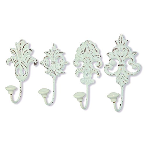 The Chateaux Fleur De Lis Wall Hooks, Set of 4, Shabby Distressed Finish, French Country Style,Rustic White, Cast Iron, Vintage Inspired, Porcelain Caps, Ea 6 3/4 Inches Tall, By Whole House Worlds
