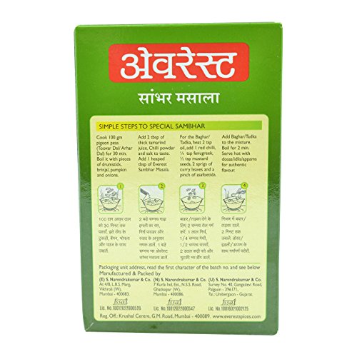-. Feature : Everest Sambhar Masala is a spice blend that captures the true essence of Sambhar! Pair this spice with drumstick, brinjal, pumpkin and onion for a delicious meal. / Everest spices allows you to spice up your meals with ease! Whether you want to add more flavor to your tea in the form of a tea masala, or want to add some flavor to a weeknight dinner with Everest's Garam Masala seasoning packet, you'll love having the vibrant aromas and the flavors of India at your fingertips. / Want the freshest spices on the market? Shop Everest! Everest's state of the art facility ensures that the spices you purchase are always top quality, with the absolute best flavor. / With this 100 gram package of Everest Sambhar Masala, you'll be cooking flavorful meals in no time! / For over 50 years, Everest has perfected the art of blending spices to please consumer tastes! Everest employs a staff of in-house experts to carefully select the finest spices and produce from all over the country. All of Everest's spice processing, packing, blending, and packing are performed at a state-of-the-art facility and are assured to have the best quality and purity!