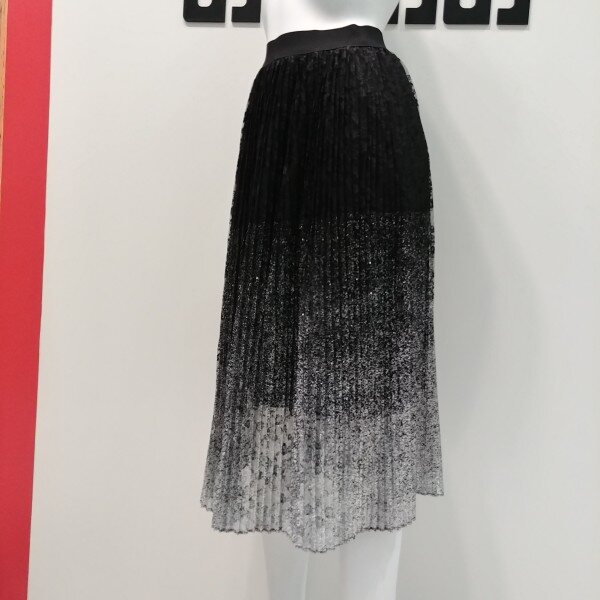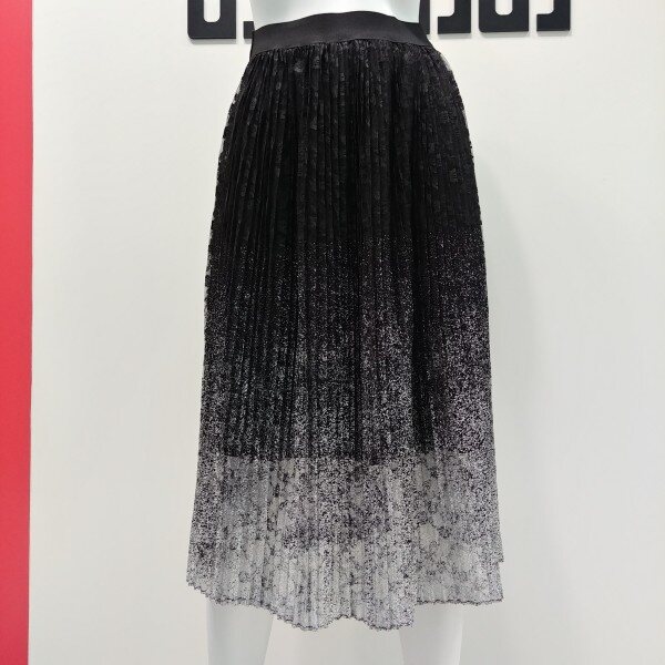 허리가 밴딩으로 들어가 착용감이 편안하고 멋스러운블랙에서 실버 그라데이션으로 스타일리쉬하게 입기 좋은주름 스커트 입니다 은운하게 비치는 실루엣에 펄이 들어가 세련된 롱 스커트 입니다 롱한 기장으로 은은한펄과 주름으로 여성미를 돋보이게 해줄 플리츠 스커트 입니다 ★30 인치 기장 입니다★