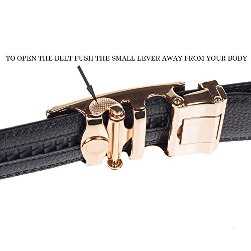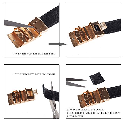 ✔Easy to use - to tighten the belt, slide the belt into the buckle and pull the tip of the belt through, the latching fasteners automatically lock the belt. Auto locking mechanism interacts with plastic "teeth" on the back side of leather.