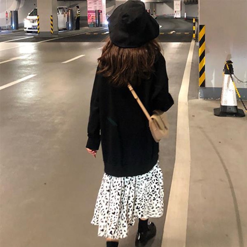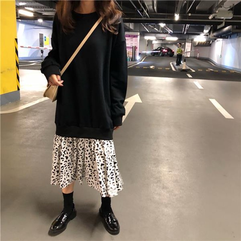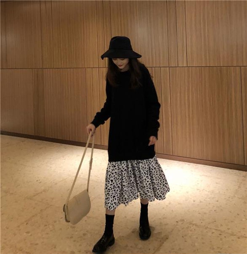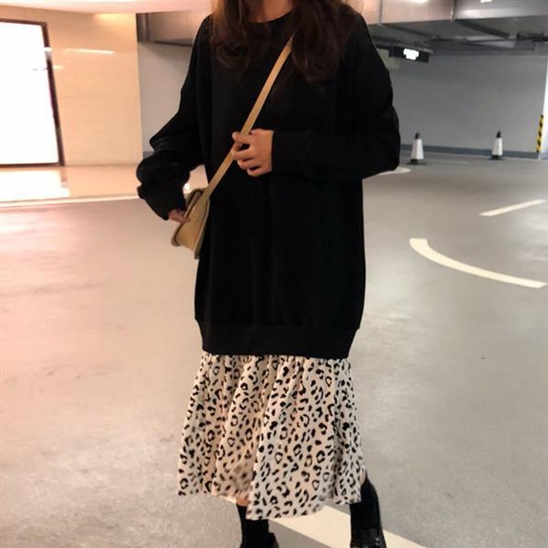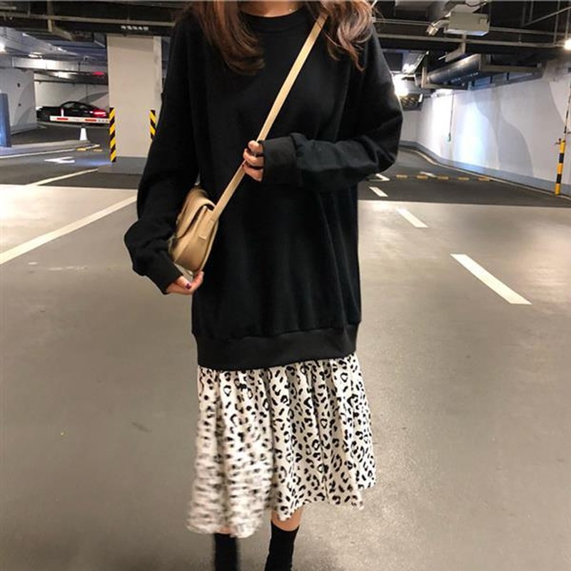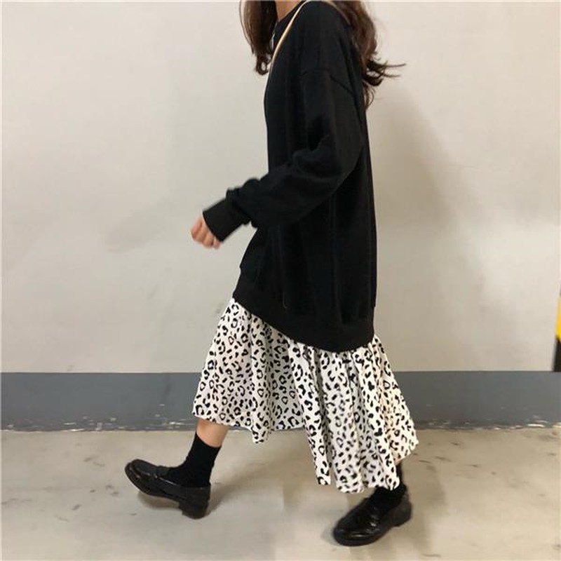 ♢ポイント♢ レオパード柄のスカートとロングトップスのレイヤード風ワンピです。 ゆったりトップスにさり気ないヒョウ柄スカートがアクセント♪