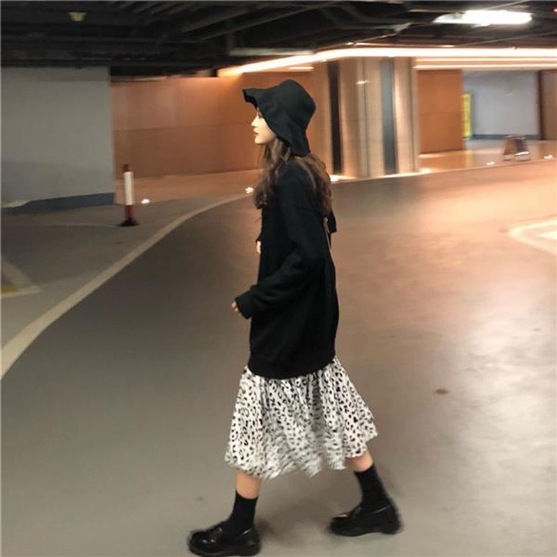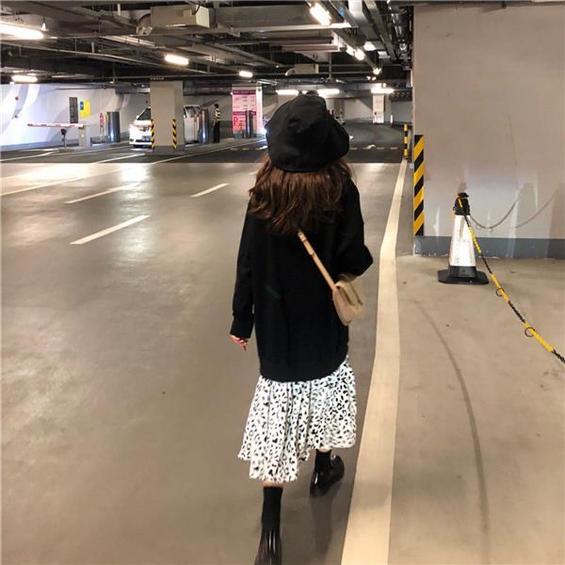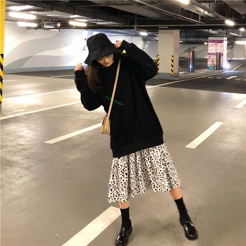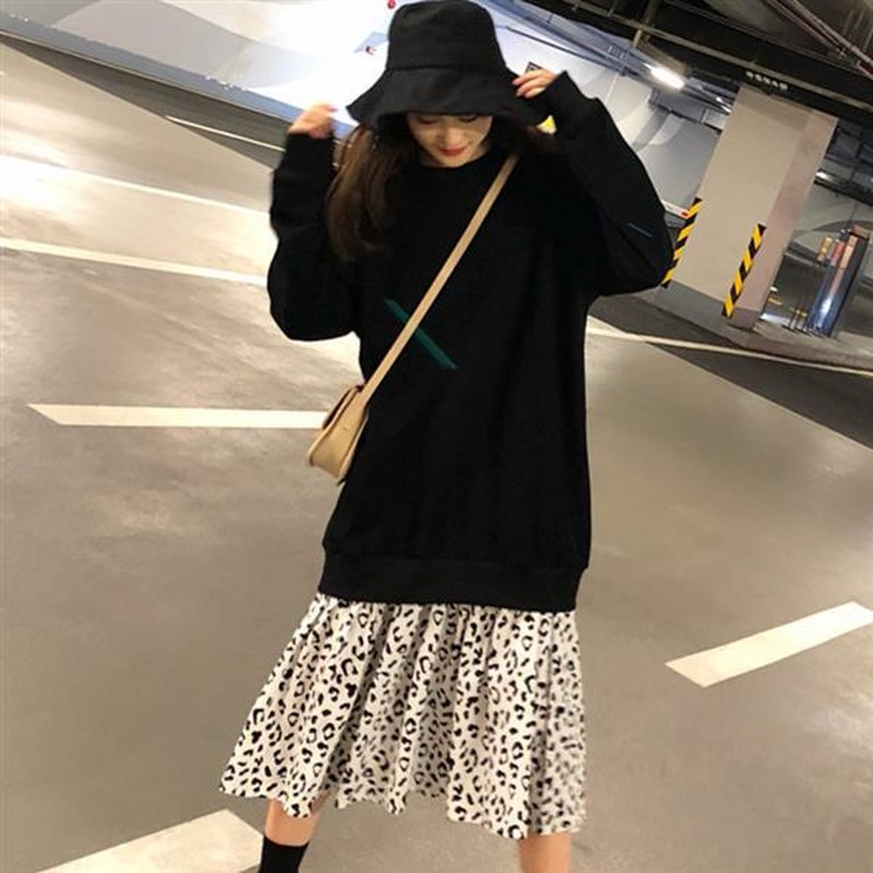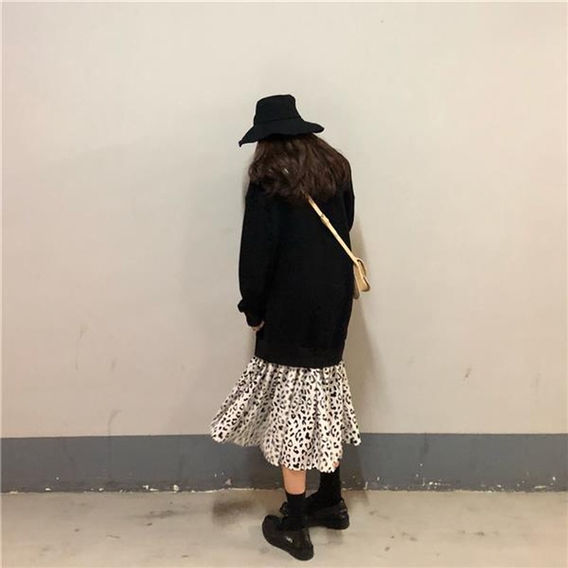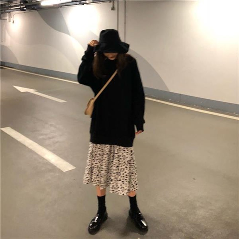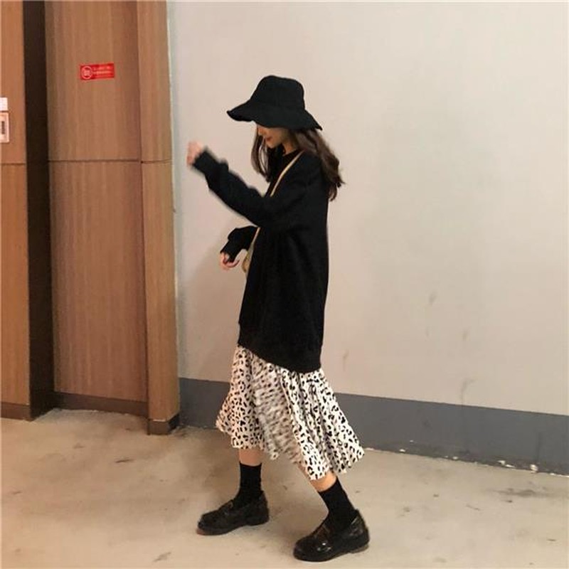 ♢ポイント♢ レオパード柄のスカートとロングトップスのレイヤード風ワンピです。 ゆったりトップスにさり気ないヒョウ柄スカートがアクセント♪