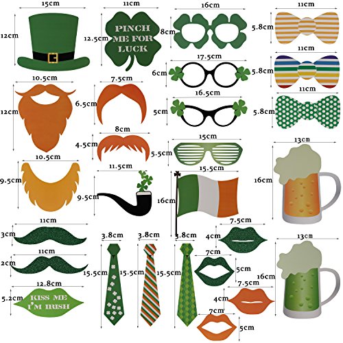 - ST PATRICKS DAY DECORATION IDEAS - Comes with 27 various designed cards in total, include mustaches, lips, hats, eyeglasses, neck ties, beers, hair, Irish flag, clover and so on.
