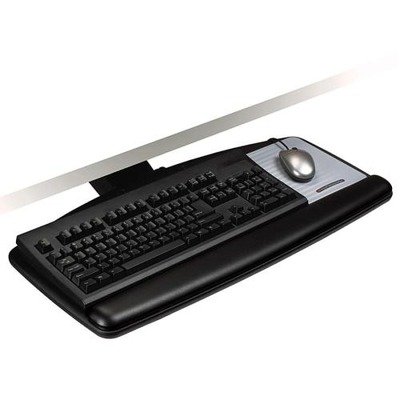 -. Feature : Standard keyboard tray with easy-adjust arm and tilt knob. Mouse surface can be positioned right or left. / All-in-one keyboard platform with 7-1/2'' height range, 360° swivel and +10°/-15° tilt. / Easy height adjustmentâ€"just tilt platform, adjust, then release to lock in place. / Dial the tilt knob to set desired angle. / Mousing surface can be positioned right or left.