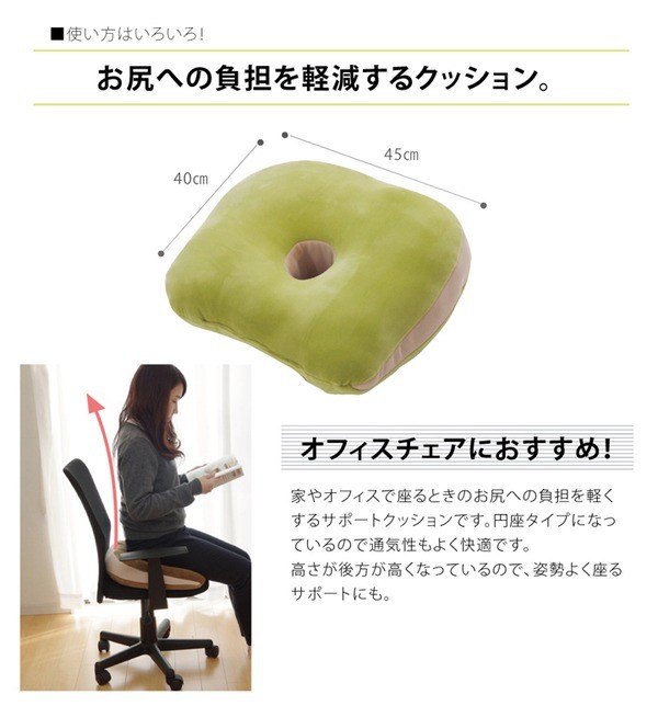 オフィスチェアにおすすめです。家やオフィスで座るときのお尻への負担を軽くするサポートクッションです。円座タイプになっておりますので通気性もよく快適です。後方が高くなっていますので姿勢よく座るサポートとしてもご使用下さい。シンプルなデザインなので、お部屋のテイストを問いません。もちもちな感触でお尻や腰への負担をやわらげてくれます。表地は、なめらかな肌触りのスーパーソフトマイクロ生地とメッシュ生地の組み合わせなので季節を問わずオールシーズンご使用頂けます。中材は低反発ウレタン3mmとポリエステル綿を使用。綿をウレタンのシートで包むことにより、沈み込み過ぎず、独特のもちもちした柔らかなタッチ感に仕上げました。