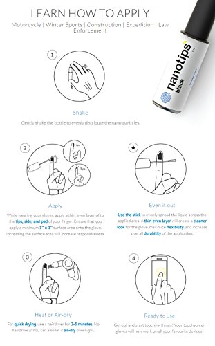 Apply. Dry. Use! Applying Nanotips is an easy three-step process. Simply shake the solution, apply (from tip to knuckle and all the way to the edge of the fingertip) and dry. It's that easy. If you use a hairdryer to dry the solution, you'll have touch-screen gloves in as little as one minute! From snowboarding gloves to work gloves and running gloves to golfing gloves, Nanotips makes them all touchscreen friendly.