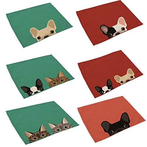 -. Title : Cotton Linen Placemats, YIFAN Set of 6 Cute Dog Cat Pattern Dining Table Mats for Kitchen