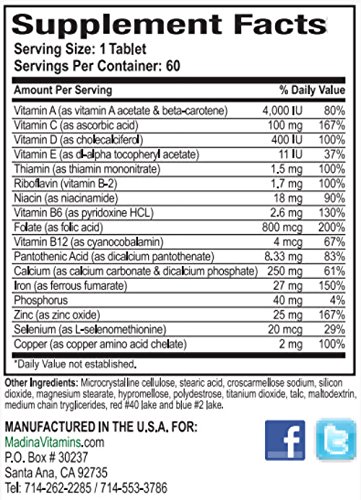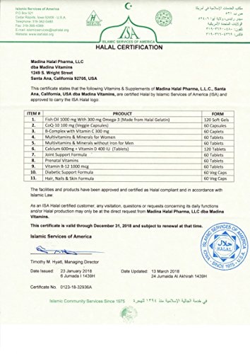 Madina Vitamins Prenatal Vitamins helps strengthen a mothers bones with Vitamin D and Calcium*. It helps support a mother's and baby's heart and spinal cord with Vitamins B6, B2, and Folic Acid*. It contains Vitamin D and Calcium that support bones and teeth health also helps maintaining healthy skin, hair and nails with Biotin, Beta-Carotene, Copper, Iron, Vitamin C, and Vitamin E. It includes Vitamin D plus extra iron to help support daily energy needs. Vitamin A, C and E supports immune system defenses. Vitamin D to aid in the metabolism of Fats, Carbohydrates and Proteins. Halal Prenatal Vitamins contains Vitamin C and E to help protect the body against the effects of physical stress. Like our all other Vitamins and Supplements Halal Prenatal Vitamins are 100% All-Natural, Free of artificial colors, additives, preservatives and flavors. It does not contains Gluten, Soy, Yeast, Milk, Eggs, Nuts, Fish or Shellfish.Feature