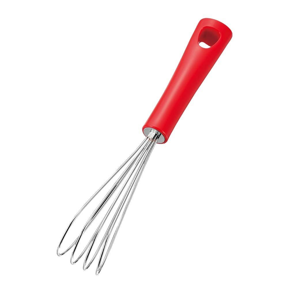 | 粉つぎの底に固まったダマもかき取りやすいまぜ器です。普通の泡だて器のようにワイヤーが交差していないので洗いやすいのが特徴です。三角ハンドルで転がらず、立てて置くこともできますよ。 |