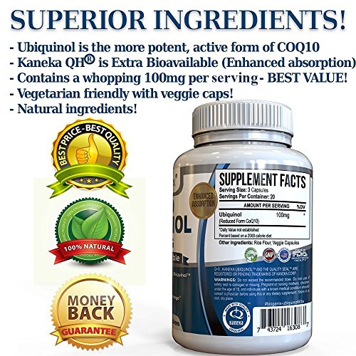Best Ubiquinol Formula with reduced, active form of CoQ10 [more potent]. This is necessary for humans in cellular energy production. Ubiquinol 100mg (3 capsules per serving) is better than regular CoQ10 Ubiquinone 200mg and 400mg.