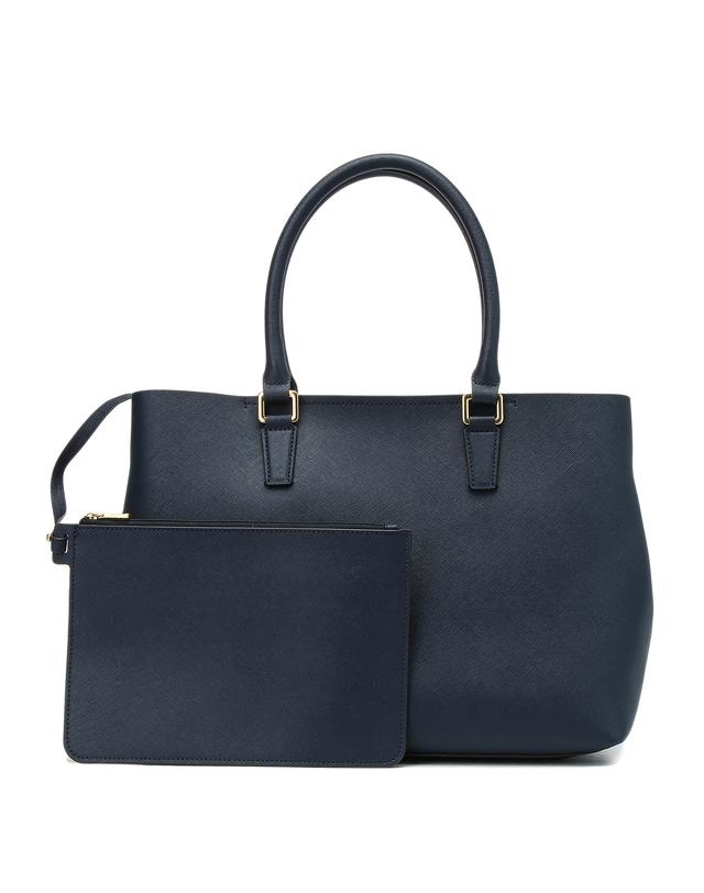 네이비 솔리드 컬러와 골드 지퍼의 조화가 고급스럽습니다.