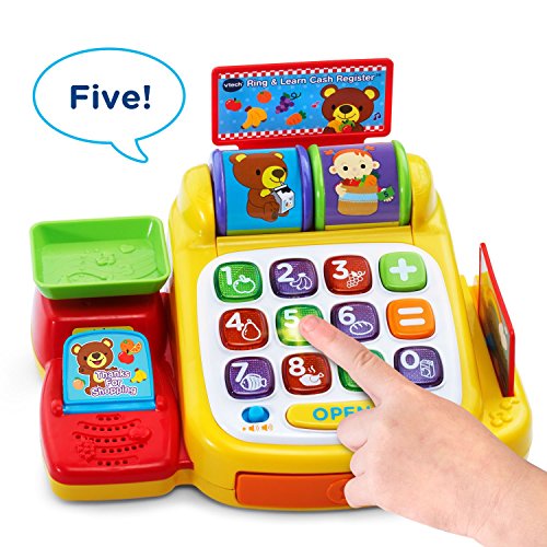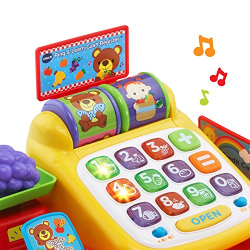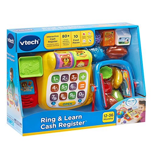 -. Feature : The Ring and Learn Cash Register encourages your little shopper to fill their basket with healthy play food and pretend to buy them; 10 pieces of healthy food, a shopping basket and a pretend credit card / The interactive cash register plays a variety of playful phrases, fun sounds, songs and music; features 80+ songs, melodies, sounds and phrases / Pressing the light-up number buttons introduces your child to numbers, colors, food and healthy-eating phrases; spinning rollers reward curiosity with lights, sounds, music and songs / For more role-play fun, slide the pretend credit card through the slot and open the cash drawer; credit card triggers voice and sounds; play in number or role-play mode / Requires 2 AA batteries (batteries included for demo purposes only; new batteries recommended for regular use); intended for ages 1 to 3 years
