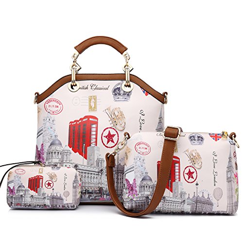 -. Feature : Ultra soft high quality synthetic leather with fabric lining. Top zipper closure. Modern gold-toned hardware / Cartoon print exterior composite bag, handbag back with zipper pocket. 3 PCS set handbag, cross body bag and purse / Four metal 'feet' help protect the bottom of your bag; One adjustable and removable shoulder strap,it can be used as shoulder strap of the message bag or handbag.Refined design,unique appearance & wonderful gift idea / The inside has 1 main compartments with a center zipped piece,and one more zipper pocket and 2 open pockets for smart phone and keys/lipsticks. May hold A4 magazine,portable textbooks,wallet,umbrella.Shoulder handbag size:13.4" x 12.6" x 5.1"(WxHxD) handle drop: 3.1" Message bag :9.4" x 7.5" x 2.8"(WxHxD) Wallet purse :6.3" x 3" x 1.6"(WxHxD) / Only items with Realer brand tag and woven bag are original! Realer is an American brand with record No.: 86973588.Please note that we never authorize any third party to sell our brand items,and we will complain any acts of infringement