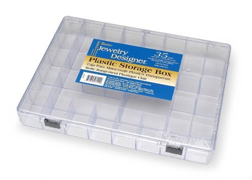 Keep beads, findings and other small items safe and sorted in this 11-3/4-inch by 8-3/4-inch clear plastic storage box. Features 35 separate compartments, 2 compartments have more space for larger items such as cord and wire. Storage box is Hinged and snaps shut. 1-1/2-inches deep.