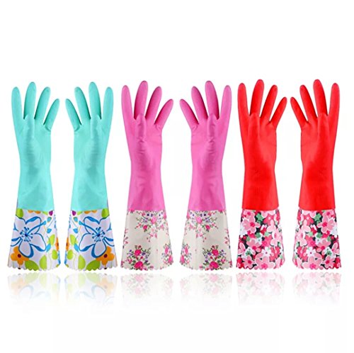 - Dimension: length of this item about 41cm/16", and package included 3 piars of large size floral long sleeves reusable cleaning latex gloves in pink, red and green colors