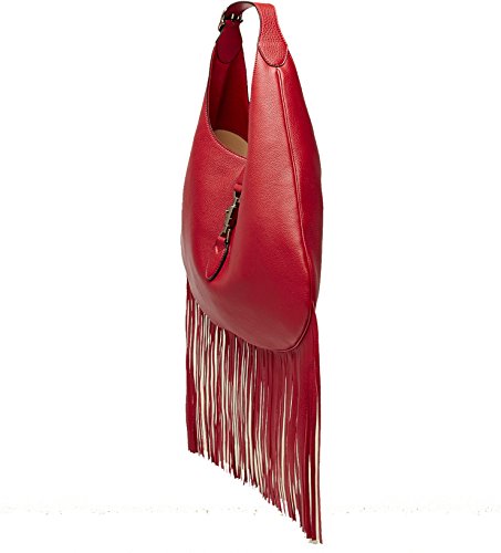 The classic Gucci Jackie Hobo gets a makeover of sorts this season courtesy of elegant fringe and a refined piston closure. In soft red leather. Nouveau Suede Fringe Hobo Bag, red Suede with rose golden hardware. Adjustable strap. Piston closure. Leather lining. Interior smart phone and zip pockets. 17"H x 12 1/4"W. Made in Italy.Feature