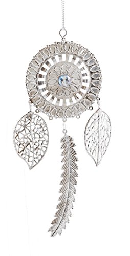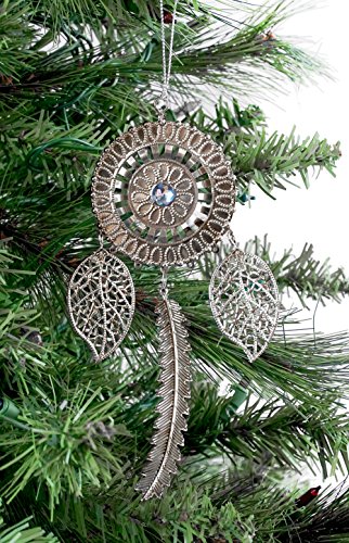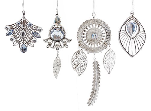 Features a set of tribal themed ornaments with jeweled accents; (1) is shaped like a dream catcher, (1) is shaped like a leaf, (1) is shaped like a mini dream catcher & (3) is has a fan shape