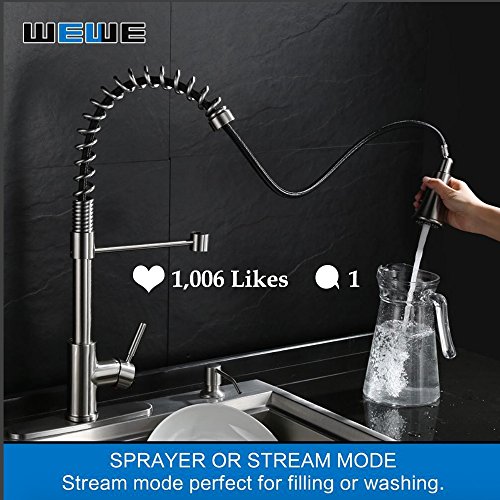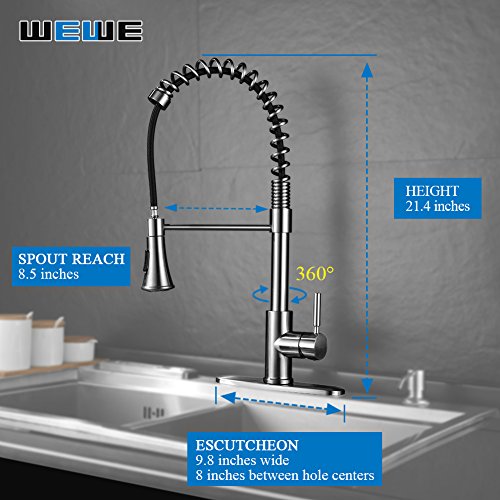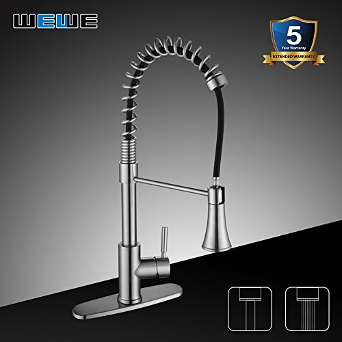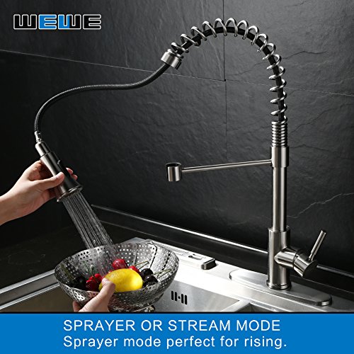 Kitchen Faucets with Pull Down Sprayer - WEWE A1002LU Commercial Single Handle Pull Out Kitchen Faucet Brushed Nickel, Modern High Arc Spring Stainless Steel Kitchen Sink Faucets with Escutcheon